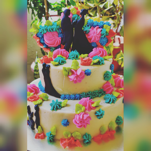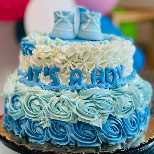 A 2 tier cake to celebrate the baby shower ceremony. Chocolate cake with whipped cream and buttercream icing
