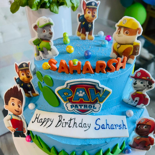 2 tier cake of paw patrol. Chocolate cake with whipped cream icing and paw patrol wafer cutouts.