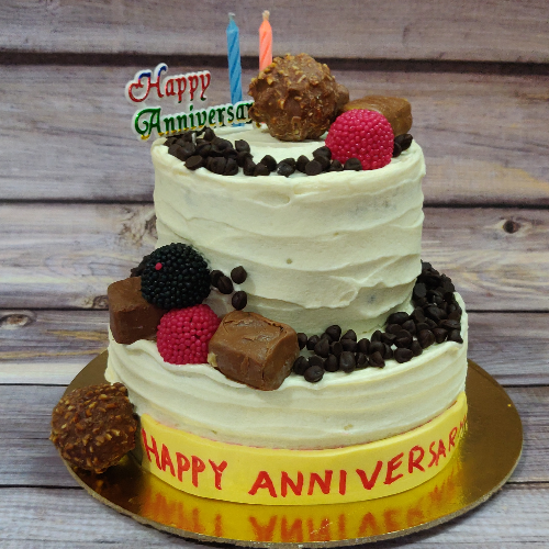 A 2 tier cake for an anniversary .This was a chocolate cake with buttercream icing and buttercream flowers and fondant accents